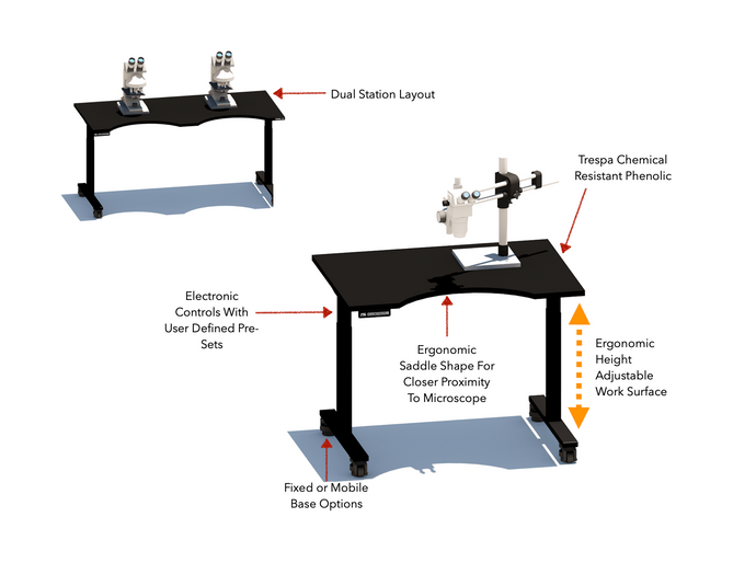 OMNI's Microscope Stations are designed as height adjustable tables with an ergonomic saddle shaped front to allow for easy use of Microscopes.