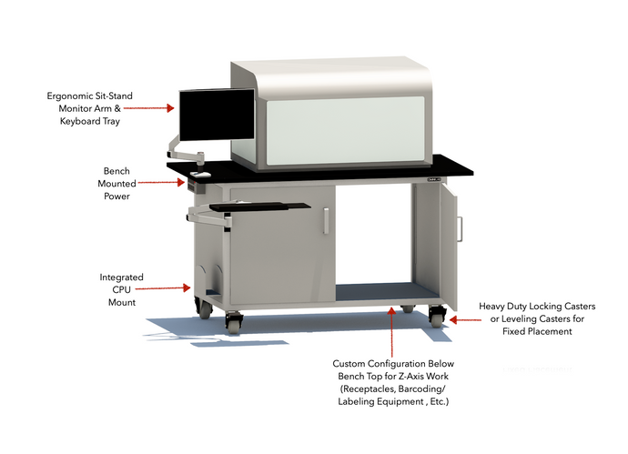 OMNI’s mobile laboratory bench systems are designed to support automated liquid handling systems and associated robotics and are available with custom configurations below the bench top for Z-Axis work, waste receptacles, barcoding/labeling equipment, etc. Our benches are designed as all-in-one mobile system to provide more space, increased mobility and allow for future flexibility and scalability within a lab environment. OMNI's bench systems support instrumentation from leading manufacturers, including Hamilton (Microlab Prep, VANTAGE, STAR and NIMBUS), Tecan (Freedom EVO series), Aurora Biomed, Beckman Coulter, Siemens, Eppendorf, and others.